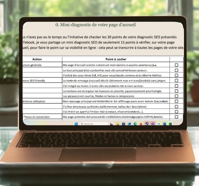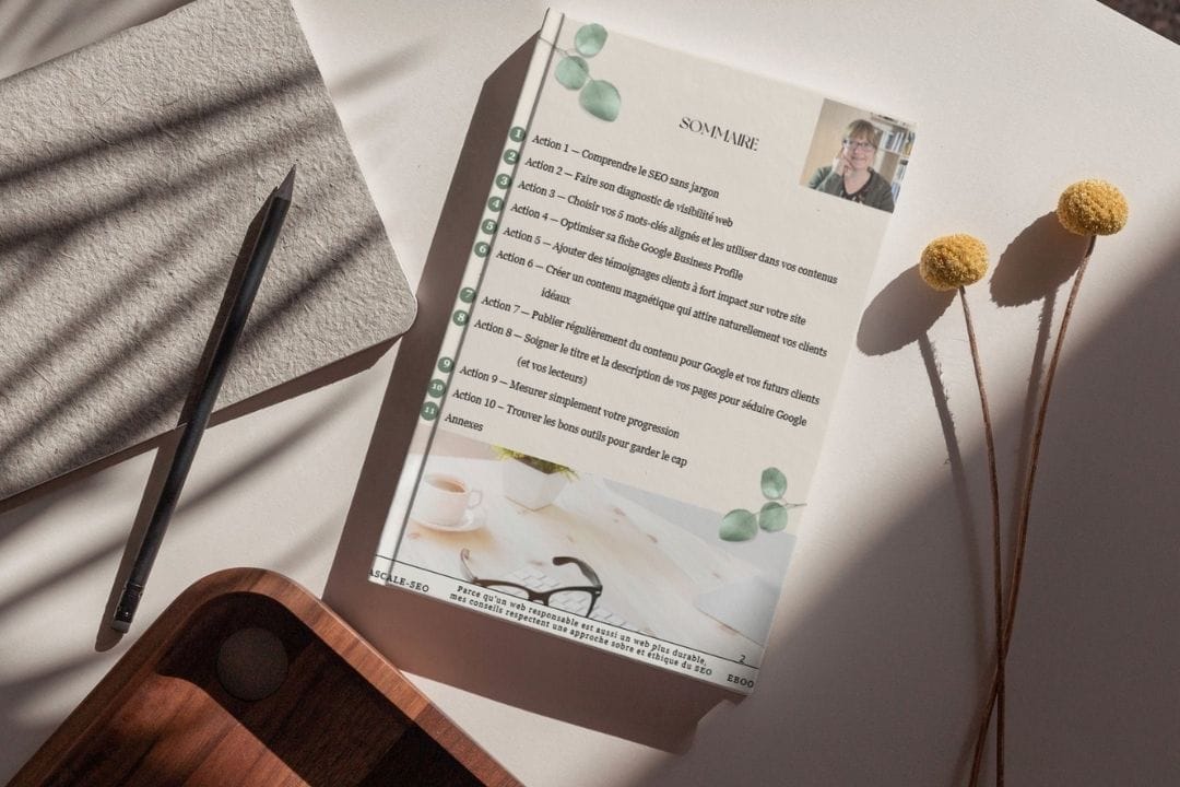✅ 10 actions concrètes et faciles à appliquer (sans jargon technique) : comment trouver des mots-clés alignés, rédiger du contenu impactant sans effort, optimiser vos pages et fiche Google…